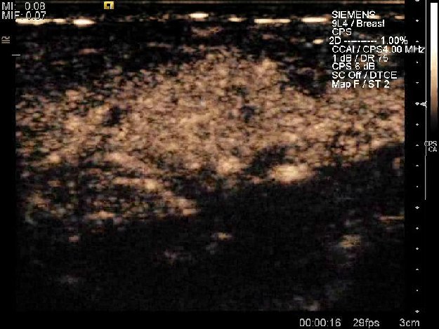 A Contrast Ultrasound Agent can also be visualised in the microcirculation of parenchymal organs, resulting in an enhancement of the vascular compartment without extravasation into the interstitial fluid. This allows an improved characterisation of breast and liver lesions.